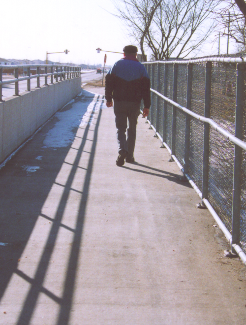 A West Fargo man enjoys a nice spring day by taking a walk across a bridge on