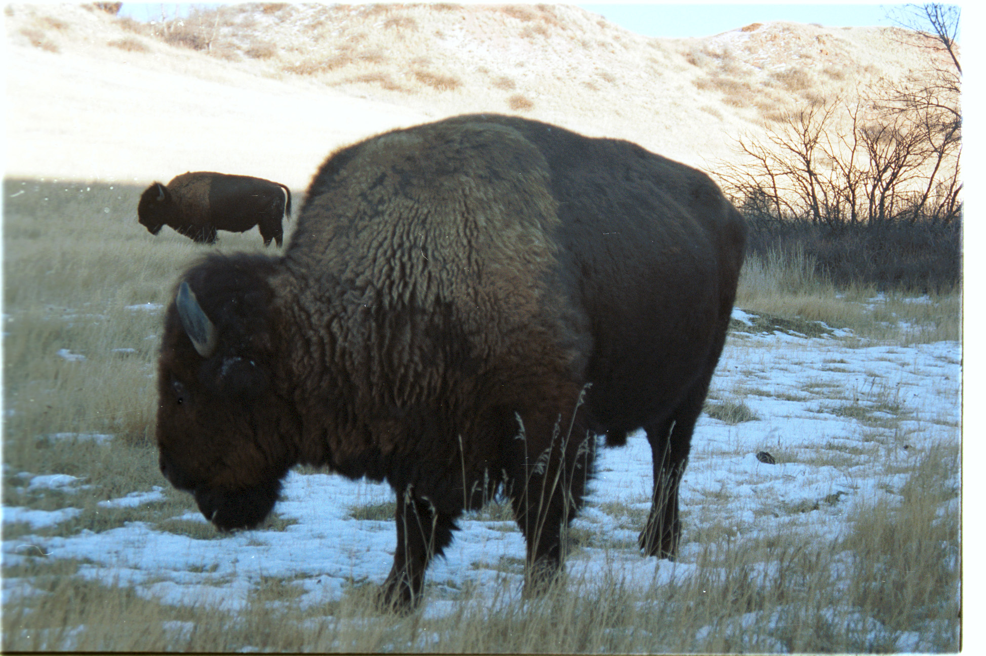 This is a picture of a buffalo eating near the road in Medora that was kind