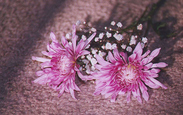 The sun shines through a window and casts a shadow around these flowers.