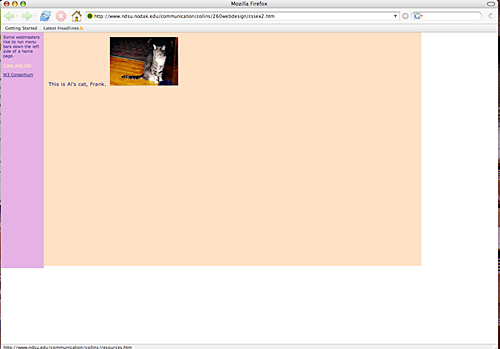 You would like to set up a home page using css. You want a menu bar running down the left side of the page. You want room for pictures and text on the right. Set up an HTML page, and make specifications as indicated.