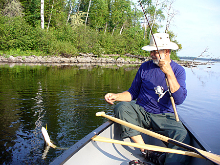 Sailboat: A few anglers like to combine a love of sailing with fishing (Big Cormerant Lake).Fishing Man: Irving Nern pulled in a catch from his canoe (Big Sugar Bush Lake).