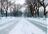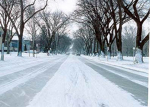 Snow blows across University Drive after a March snowfall.