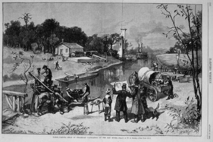 An engraving of Fargo, Dakota Territory, during its Red River steamboat days.